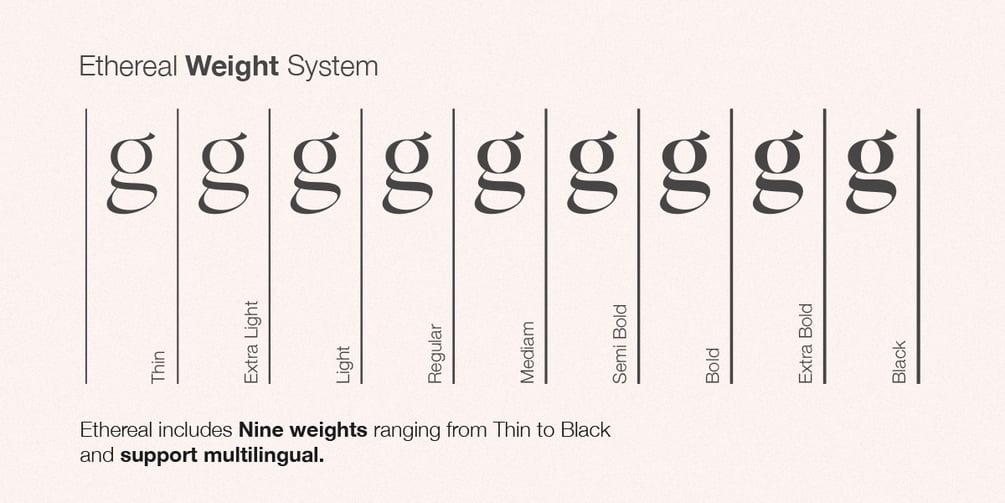 Ethereal is a modern serif font family with 9 weights, blending elegance with contemporary style. Designed by Kereatype, this font exudes sophistication and charm, making it perfect for elevating your designs. With its versatile weights and stylish details, Ethereal is more than just a font, it’s a statement of modern luxury.